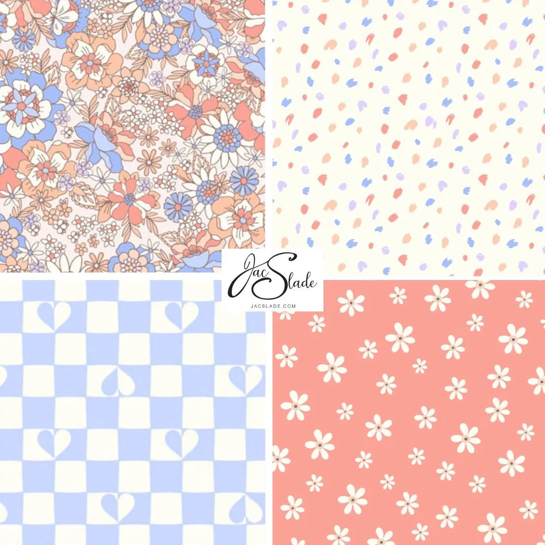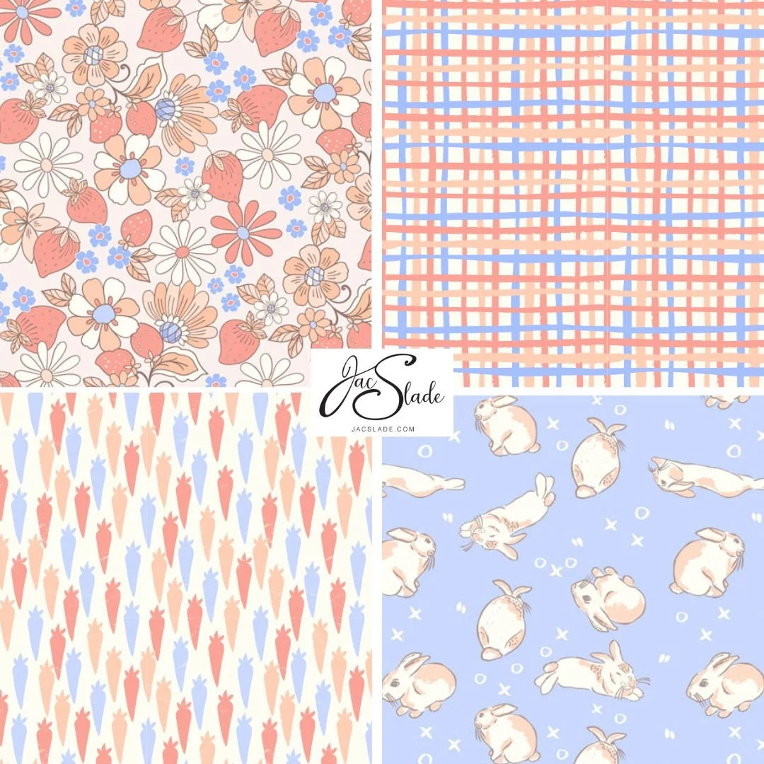 Candyfloss Easter is a whimsical collection of Springtime Easter themed pattern designs with cute bunnes, retro florals, carrots, checks and spots in a sweet candy pastel palette. These seamless pattern designs are perfect for home decorators, Interior designers, makers and sewists, home decor, table linens, wallpaper, bedding, stationery and gift wrap.