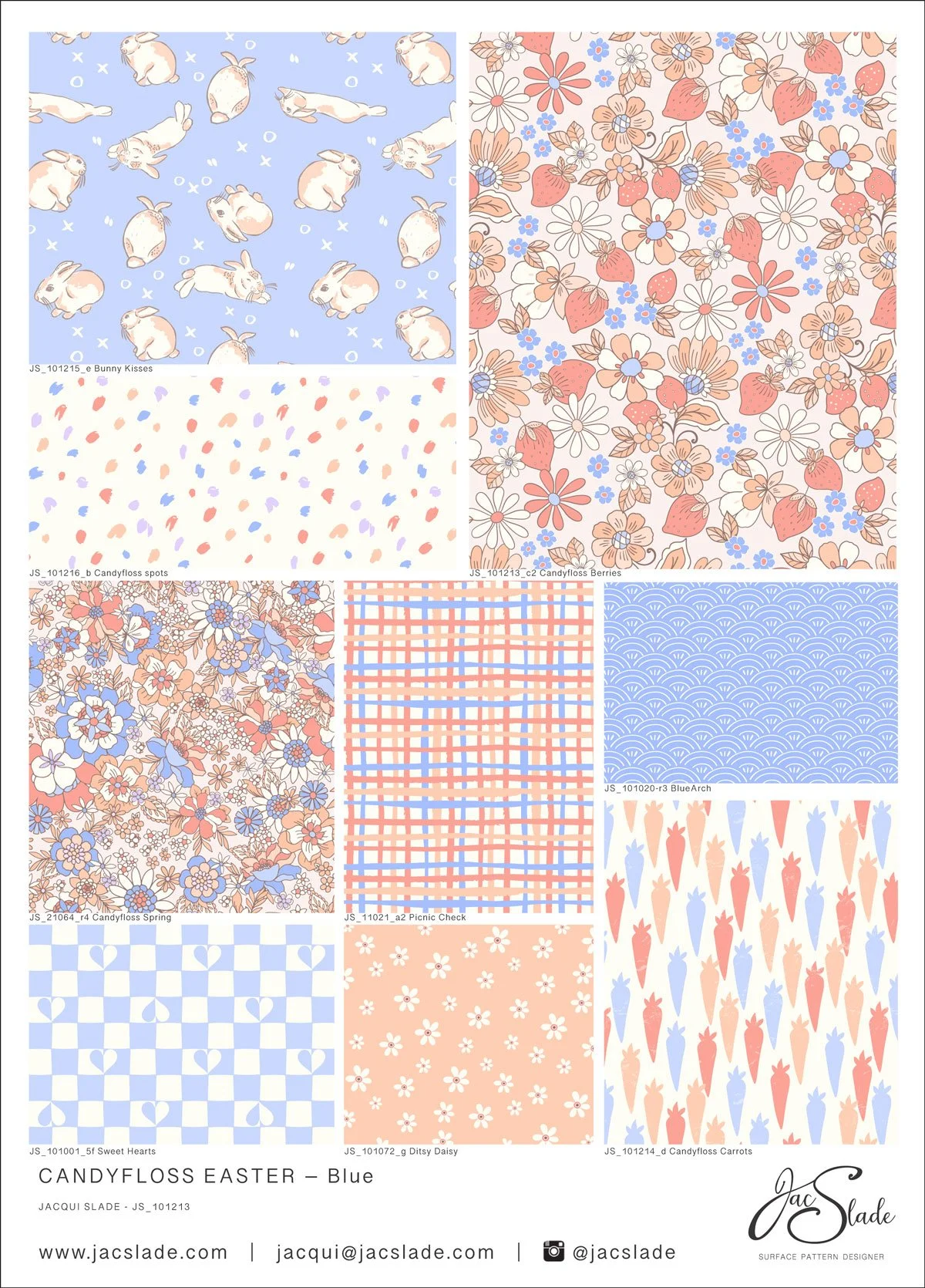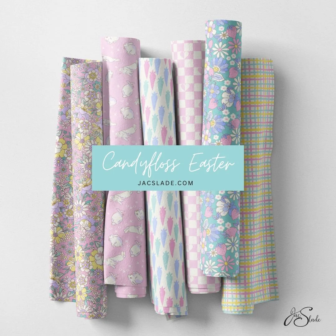 Candyfloss Easter is ready to order on 30 fabric bases, 6 wallpaper substrates, home decor products and bedding all printed in the USA. Seamless pattern designs are available to license for any industry as hi res digital files ready to use or with customisations made if required.